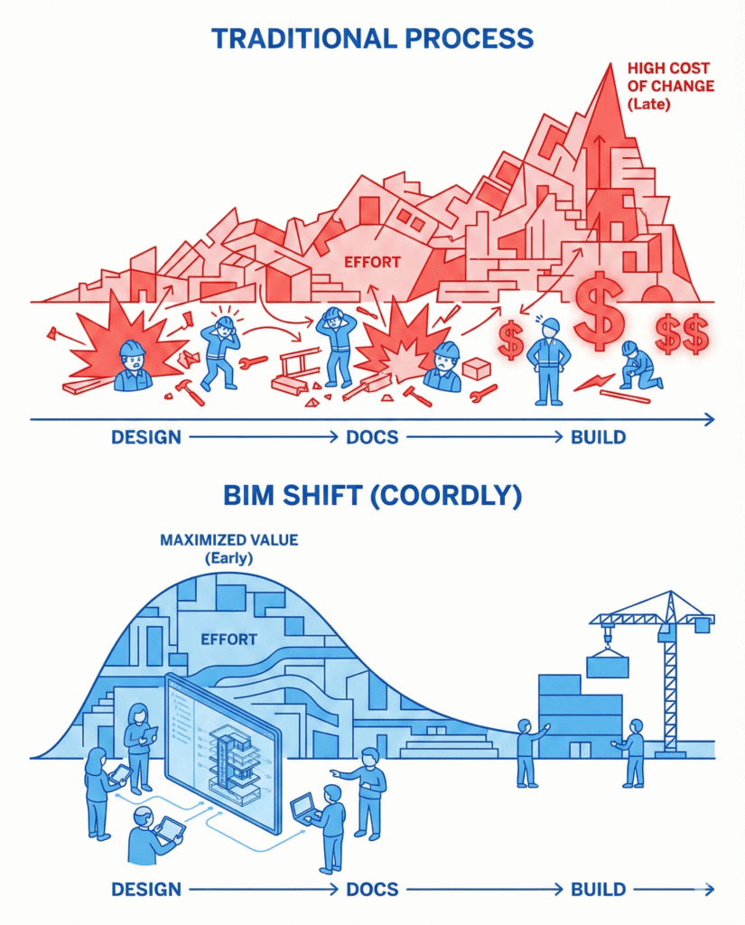 Um estudo conduzido por empresas brasileiras de engenharia mostrou que 61% das incompatibilidades de obra poderiam ser evitadas com coordenação digital integrada.
